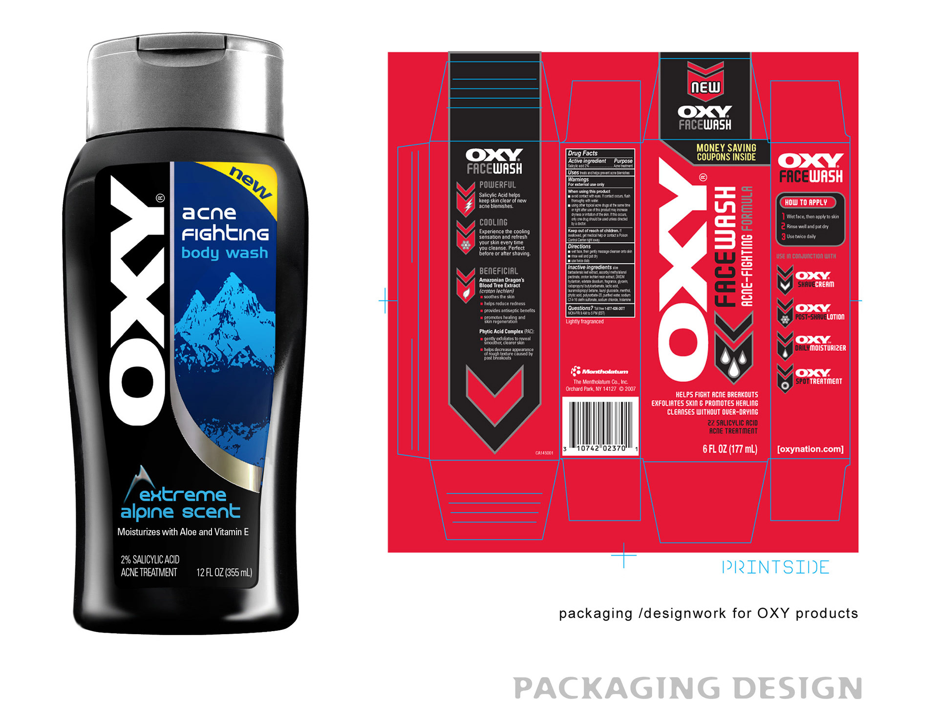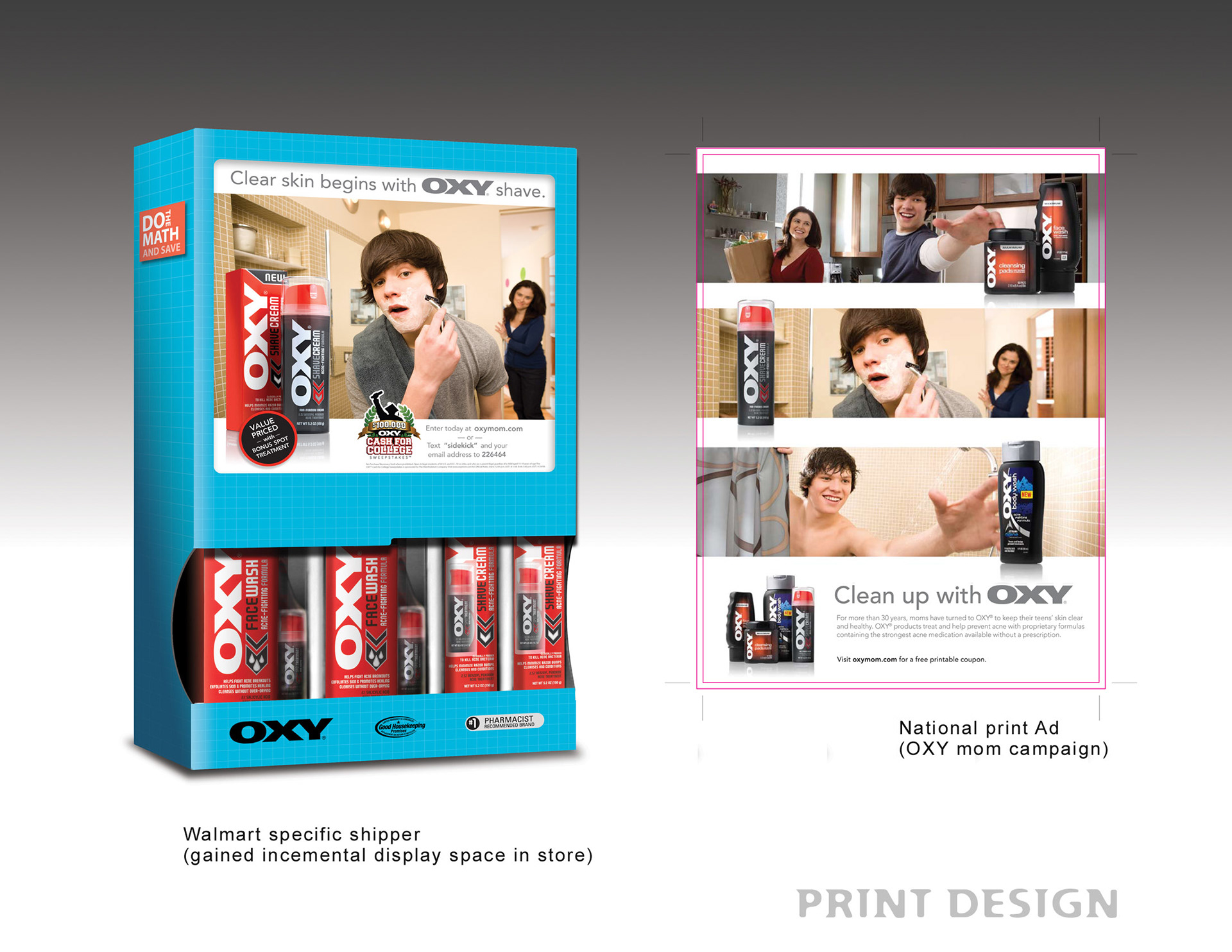 Contracted project for multiple OXY product lines. Creative direction, project management, product /packaging design, retail-specific product shipper and traditional print-ad supporting (new) OXY mom national ad campaign.